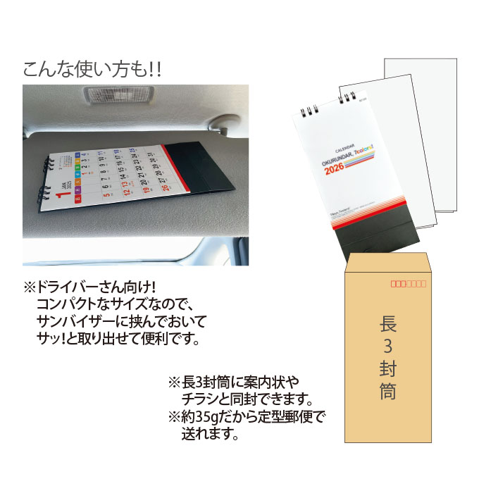 オクルンダー・セブンカラーズ-NZB1520は、スタンドがW100×H180mmの縦長の卓上カレンダーです。長3封筒に入れることができるサイズのため、取引先に提出する書類と一緒に送ることができます。 オクルンダー・セブンカラーズ-NZB1520は、約35gで軽量のため定型郵便で送ることができ、社内で配布する際も便利なサイズ感です。デスク周りに設置してもスペースを取りにくいため、書込みはしないが日程を確認したい場合におすすめです。 年末年始の販促にカレンダーを送付したいと考えている企業におすすめのカレンダーです。