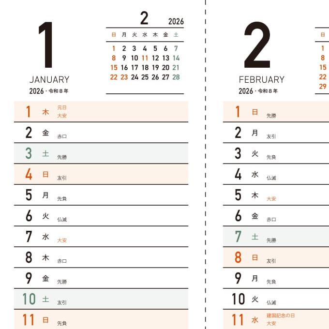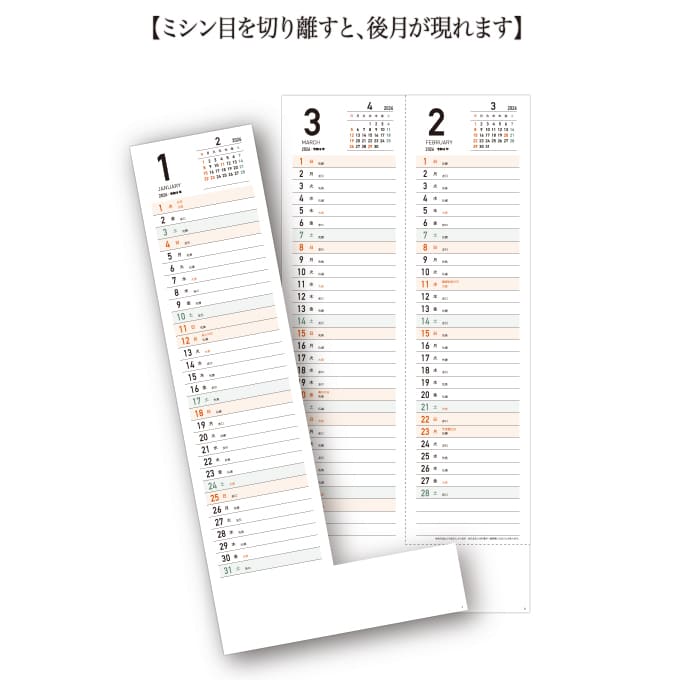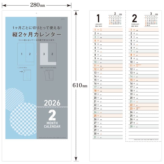 縦2ヶ月カレンダー_KY-111は、ミシン目が入っており、切り取ることで新しい月を表示できるカレンダーです。 このカレンダーは、縦に2ヶ月分を一度に確認できるレイアウトが特徴で、視認性が高く、月のスケジュールの管理が簡単です。また、土曜日が青色、日曜日・祝日が赤色に色付けされており識別しやすいカレンダーです。 縦2ヶ月カレンダー_KY-111は、スリムな縦型デザインでスペースを取らず、オフィスのデスクにもすっきり置くことができます。